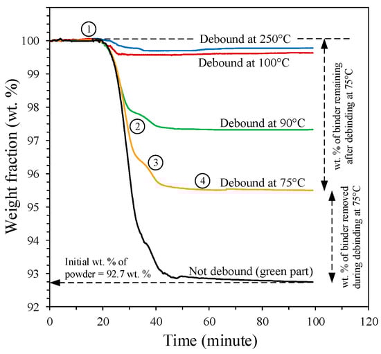where and are the weight fractions of binder remaining and removed during debinding, respectively, and are graphically represented in Figure 9. In the case of the green part, which contains all of its initial 40 vol. % of binder (i.e., no mass loss due to the debinding operation), the final weight corresponds to the weight fraction of powder (), which was also used to validate the initial solid loading using Equation (26):