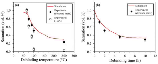Comparison between experimental and simulated saturation as a function of (a) debinding temperature after 2 h of treatment, and (b) debinding time at a constant temperature of 100 °C.