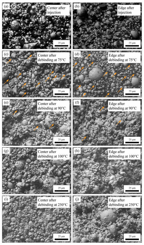 The injected part and the parts debound for 2 h at various temperatures were observed using a scanning electron microscope (SEM), with representative micrographs presented in Figure 11. For a given part, no significant difference can be seen for the SEM micrographs taken at the center and at the edge. The SEM observations of the as-injected part reveal a uniform distribution of the binder throughout the powder network (Figure 11a,b). The absence of binder-rich or binder-poor regions confirms an adequate feedstock preparation protocol and suggests that capillary-driven binder migration during thermal wick-debinding is expected to occur uniformly across the part. In contrast, the SEM observations of the part debound at 75 °C reveal significant residual binder, as indicated by arrows in Figure 11c,d. With only about a third of the binder removed under this condition (see Figure 9), this temperature appears to be too close to the binder’s melting point of approximately 59 °C (measured in []) to significantly promote mass transport mechanisms. The interconnection and continuity in the binder arrangement indicates insufficient capillary action for effective extraction out of the part. However, at a debinding temperature of 90 °C, the binder appears more isolated, forming discrete clusters with traces covering metallic powders (highlighted by arrows in Figure 11e,f). This indicates that a moderate increase of 15 °C relative to the previous condition reduces the binder viscosity sufficiently for capillary forces to become effective in extracting the binder from the part. Following debinding at 100 °C and 250 °C (i.e., both below the temperature at which polymer degradation begins), the SEM micrographs presented in (Figure 11g–j) reveal a binder-free powder network with no significant traces of residual binder. This observation is consistent with the low residual binder content measured experimentally under these debinding conditions (see Figure 9).