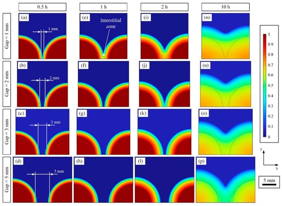 Influence of the gap size on the spatial distribution of the binder over debinding time: (a) 0.5h-1mm; (b) 0.5h-2mm; (c) 0.5h-3mm; (d) 0.5h-5mm; (e) 1h-1mm; (f) 1h-2mm; (g) 1h-3mm; (h) 1h-5mm; (i) 2h-1mm; (j) 2h-2mm; (k) 2h-3mm; (l) 2h-5mm; (m) 10h-1mm; (n) 10h-2mm; (o) 10h-3mm; (p) 10h-5mm.