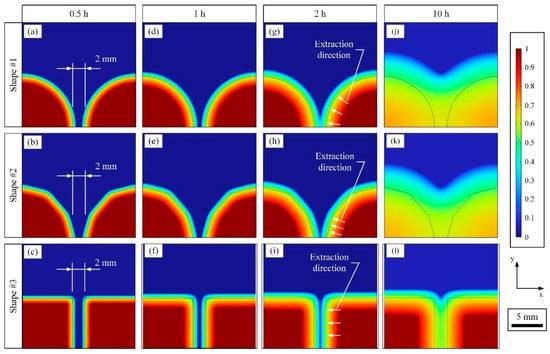 Influence of the part geometry on the spatial distribution of the binder over debinding time: (a) 0.5h-shape #1; (b) 0.5h-shape #2; (c) 0.5h-shape #3; (d) 1h-shape #1; (e) 1h-shape #2; (f) 1h-shape #2; (g) 2h-shape #1; (h) 2h-shape #2; (i) 2h-shape #3; (j) 10h-shape #1; (k) 10h-shape #2; (l) 10h-shape #3.