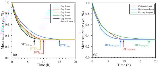 Similarly, the results obtained in Figure 13 were transposed into mean binder saturation as a function of time and plotted in Figure 14b for different part geometries. Once again, this temporal representation confirms that the overall shape of the parts may significantly affect the time required to reach irreducible saturation. In this work, rectangular parts placed in close proximity induced a strong binder front interaction that reduced the efficiency of the wicking medium. As a result, although the dodecagonal and cylindrical geometries required a similar Debinding Time Threshold (9 < < 10 h), the same volume of powder-binder mixture required nearly twice as long to debind when injected into a rectangular shape ( 18 h). Despite having comparable debinding times, it is interesting to note that a slight geometrical change from a cylindrical to a quasi-cylindrical shape (the dodecagonal part) leads to distinct interactions between the binder fronts (visible in Figure 13g,h), which in turn altered the debinding rate from a mean saturation of approximately 0.65. On one hand, the cylindrical part began with a debinding rate of approximately 0.15 vol. %/h, which gradually decreased to a nearly constant rate of around 0.05 vol. %/h until irreducible saturation was reached at 10 h. On the other hand, the dodecagonal part maintained its initial debinding rate of about 0.15 vol. %/h for a longer duration before undergoing a sharp reduction to 0.025 vol. %/h, reaching irreducible saturation in 9 h. The investigation of this subtle change in debinding rate accounting for the minor variations in could only be revealed through numerical modelling. Therefore, the numerical tool developed in this work can be used to define the appropriate process parameters such as the inter-part spacing, part geometry, or other parameters not investigated in the present project such as feedstock solid loading and proportion of each binder component in the feedstock. By identifying such parameters, the model facilitates the reduction of debinding time while optimizing the space within the alumina bed, and ultimately, enhances the overall productivity of the wick-debinding process.