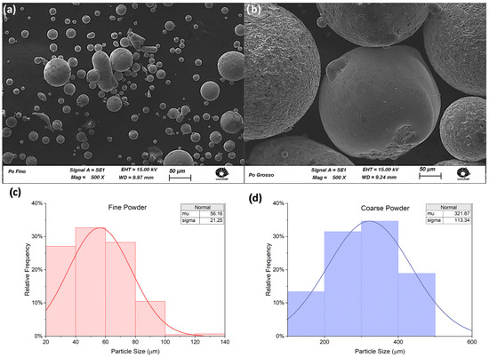 Morphology and particle size distribution: (a,c) fine powder, (b,d) coarse powder.