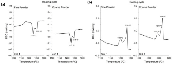 The thermograms presented in Figure 2 show that both particle sizes presented two consecutive pronounced endothermic peaks in the heating cycle at temperatures of 1231 °C and 1252 °C (fine powder) and 1227 °C and 1245 °C (coarse powder). These peaks were associated with the formation of a liquid phase and/or dissolution of eutectic borides. The cooling cycles (Figure 2b) attested that the transformations were reversible, once exothermic peaks were observed at similar temperatures. The exothermic peaks of the fine powder were observed at 1233 °C and 1183 °C, and for the coarse powder at 1217 °C and 1193 °C. These temperatures were above the eutectic temperature based on the Fe-B binary system [18], indicating an additional effect of the alloying elements that shifted the liquidus temperature. Based on the isopleth of the Fe-Cr-Ni system [19], and the fact that when sintered at 1250 °C, as reported in a prior study [14], the specimens lost their shape due to an excess of liquid phase, it was most likely that these peaks corresponded to the following transformations: δ → δ + L and δ + L → L. Although the liquidus temperature was below the reported value for the Fe-Cr-Ni system, it could be a result of boron decreasing the liquid phase formation temperatures [7]. Reported Thermo-Calc simulations in the literature using similar compositions indicated a eutectic transformation around the same temperature range [4,20].