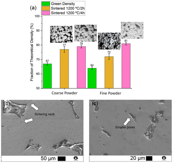 (a). Fraction of theoretical density achieved with different sintering parameters and particle sizes. (b) SEM-SE images coarse powder sintering necks and (c) SEM-SE images fine powder sintering necks.