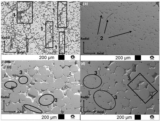 The SEM images of the sintered microstructures recorded with the secondary electron detector are shown in Figure 4. The fine powder presented a considerable decrease in porosity with an increase in sintering time (Figure 4a,b), especially in the radial direction, as depicted by the rectangles in Figure 4a. The large, crack-like pores in the radial direction were caused by the uniaxial compaction process that typically leads to compaction inhomogeneities and thus density gradients. The sintering evolution with the fine powder achieved a stage where the primary powder particles were indistinguishable and the porosity became isolated. This indicates that the third stage of sintering was reached [21] and that increasing the sintering time was very effective for densification. The improved densification could be explained by the formation of liquid phase during sintering. With longer sintering times, the liquid phase was able to fill the empty spaces and pores more efficiently. Moreover, most of the pores showed an irregular shape (Figure 4b, arrows), which could be an effect of the liquid phase solidification during cooling.