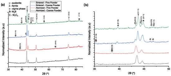 X-Ray diffraction patterns of atomized powders and sintered specimens are shown in Figure 5. The powder diffraction peaks could be identified as α-ferrite, γ-austenite, and borides. The boride peak was small and only observable in the fine powder due to the higher counts that are naturally achieved when measuring fine powders by XRD. The diffraction patterns of sintered specimens showed additional peaks of two intermetallic phases, M7C3 carbide and the sigma phase. The source of carbon for carbide formation was the stearic acid used as a lubricant in the compaction step. During the initial heating of the sintering cycle, the organic lubricant was degraded, but some carbon likely remained in the sintered material. Moreover, with the slow cooling rate after sintering, the precipitation of the carbides and sigma phase was expected to occur. The precipitation of the sigma phase with slow cooling rates agrees with literature reports [9,22]. Although the sigma phase is typically associated with material embrittlement, its impact is less detrimental in this case due to the substantial volume fraction of borides present in the steel, as shown in Figure 6. While the presence of sigma phase and carbides in duplex steels may contribute to embrittlement, their combined effect (alongside borides) should benefit wear resistance. Carbide formation can be mitigated by using carbon-free lubricants, such as borax, or by optimizing the sintering atmosphere. Additionally, increasing the cooling rate can help prevent sigma phase precipitation by minimizing formation kinetics.