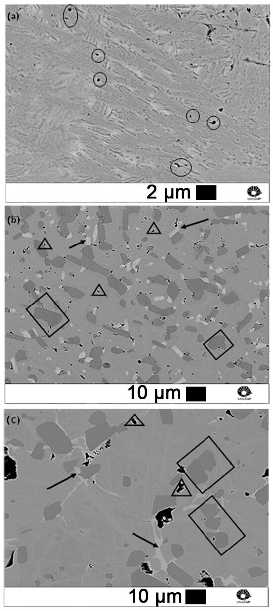 SEM images of the atomized fine powder and the sintered specimens recorded with the backscattered electron detector are shown in Figure 6. In the atomized powder, Figure 6a, small borides could be observed embedded in a fine duplex α + γ matrix. The borides were found with a faceted and elongated morphology, as well as with a circular shape, indicated by the circles. These observations are in accordance with the XRD results. Therefore, despite the fast cooling rates of the atomization process, borides were already present in the pre-alloyed powder.