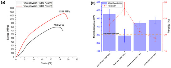 Mechanical properties of the sintered specimens. (a) Stress–strain curves measured with the sintered fine powders at different sintering times, and (b) microhardness and porosity of all investigated conditions.