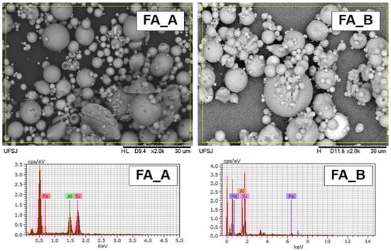Figure 2. Scanning electron microscopy and EDS spectra of the elements present on the surface of FA_A and FA_B.