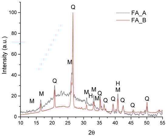 The XRD patterns of the two fly ash samples (FA-A and FA-B) are presented in Figure 3. Both materials exhibit crystalline phases commonly found in coal combustion residues, with intense peaks assigned to quartz (Q, SiO2), mullite (M, Al6Si2O13), and hematite (H, Fe2O3). Quartz is clearly identified by the strong reflection at 2θ ≈ 26.6°, while mullite is detected at characteristic peaks near 2θ ≈ 16.5°, 26.2°, 33.1°, 35.2°, and 40.8°. Hematite is observed mainly at 2θ ≈ 33.2° and 35.6°, consistent with the iron oxide content revealed by chemical analysis.