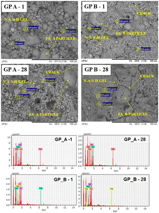 Figure 4. SEM images of the alkali-activated and EDS spectra of the elements present on the surface of the alkali-activated samples produced with the different FA samples after 1 (GP-A-1 and GP-B-1), and 28 days (GP-A-28 and GP-B-28), respectively.