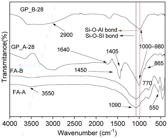 Figure 5. FTIR spectra of hardened samples produced with different FA samples after 28 days.