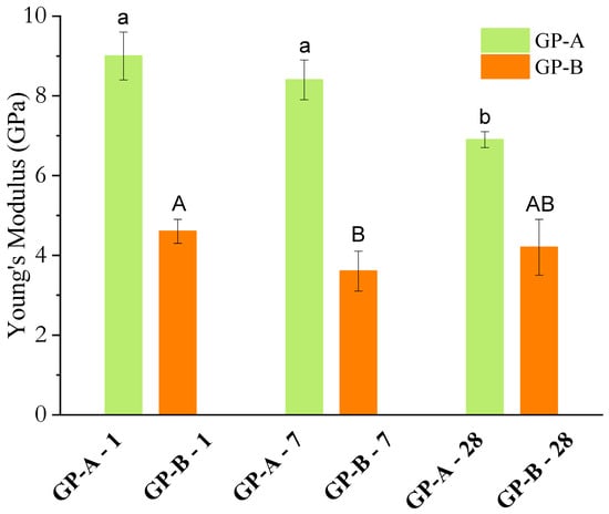 The corresponding elastic modulus values followed the same trend, with GP-A registering 9.0 GPa and GP-B 4.6 GPa at 1 day, indicating a stiffer and more compact microstructure in FA-A-based AAMs, as presented in Figure 8. This correlation between compressive strength and elastic modulus suggests that the densification of the binder matrix, observed in SEM images for GP-A, is directly reflected in its load-bearing capacity.