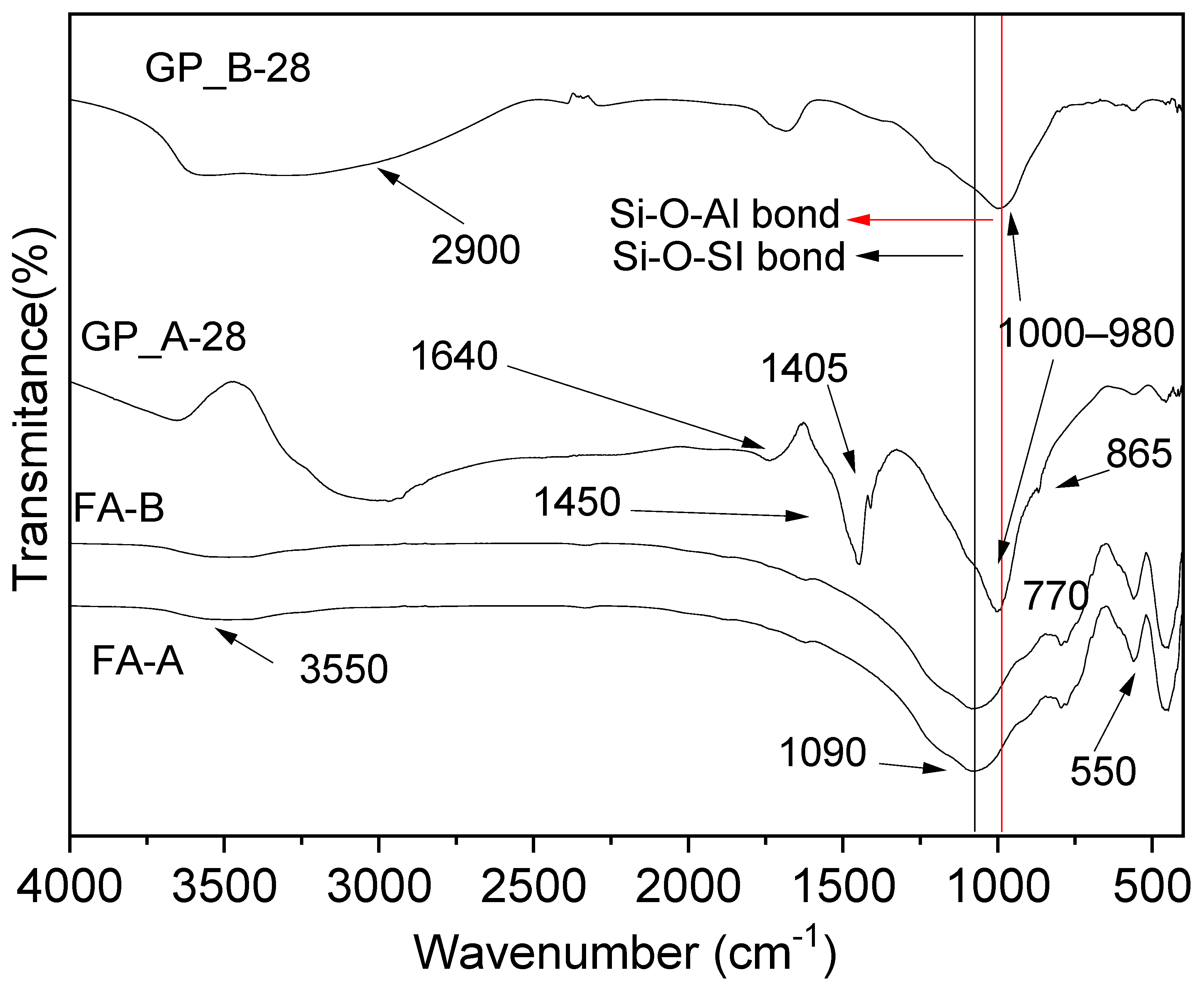 The superior early-age strength of GP-A can be directly associated with the higher proportion of amorphous aluminosilicate phases, as evidenced by the broad diffuse halo observed between 10° and 35° (2θ) in the XRD pattern. This halo indicates the presence of poorly ordered structures, which are more susceptible to alkaline dissolution and capable of releasing larger amounts of Si and Al species for N–A–S–H gel formation. This enhanced reactivity explains the higher dissolution rate of FA-A and the greater initial strength development of its corresponding matrices.