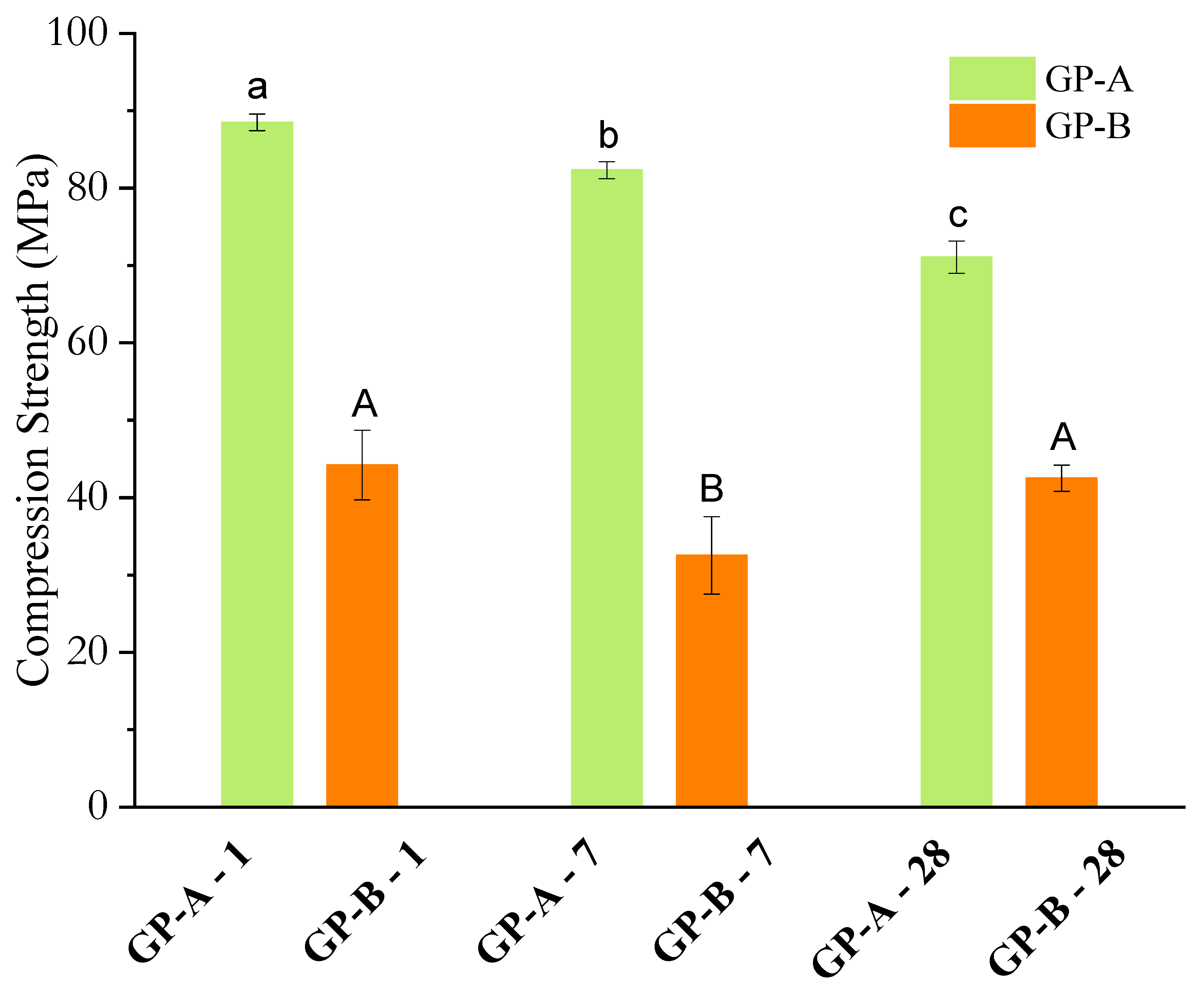 The compressive strength results (Figure 6) clearly demonstrate the influence of fly ash precursor characteristics on the mechanical performance of alkali-activated materials. After 1 day of curing, GP-A achieved 88.5 MPa, which is approximately 100% higher than GP-B (44.2 MPa). At 7 days, GP-A maintained a significant advantage, reaching 82.3 MPa compared to 32.5 MPa for GP-B, an increase of approximately 153%. Even after 28 days, GP-A still exhibited 71.1 MPa, remaining 67% higher than GP-B (42.5 MPa).