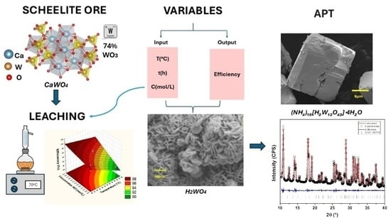 - Li, X.; Jiang, H.; Peng, Z.; Duan, A.; Zhang, T.; Gong, Z. Leaching of Scheelite Concentrate for Tungsten Extraction. Minerals 2025, 15, 475. [Google Scholar] [CrossRef]