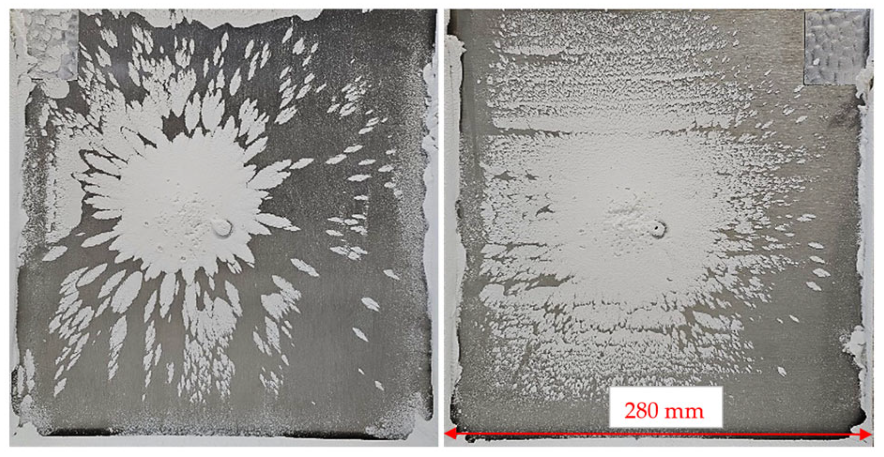 3.3.1. Influence of Rolling or Drawing Lines on the Plates and the Plate Thickness