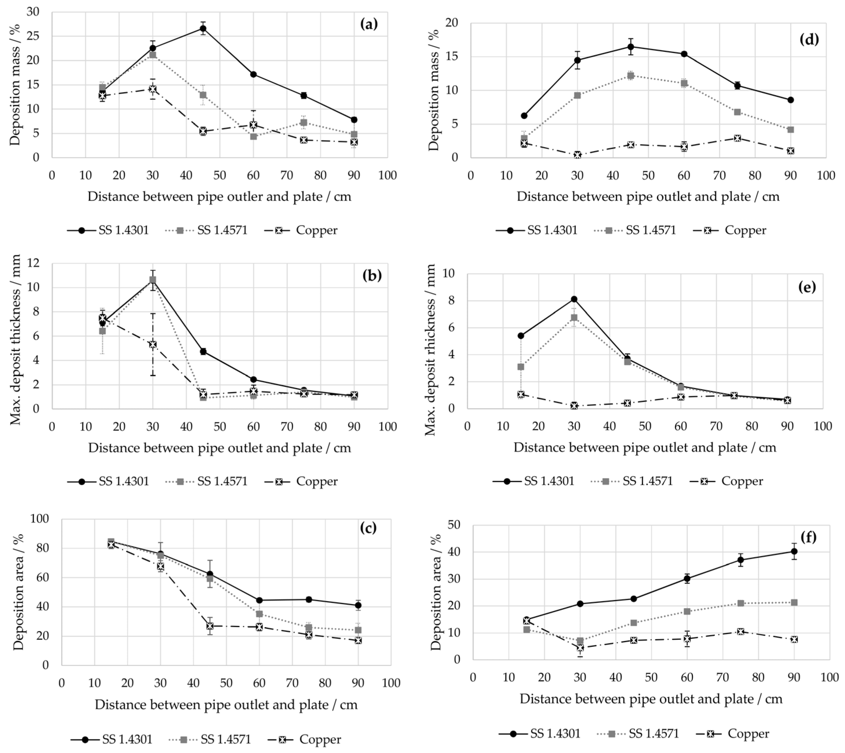| Deposition area ↑ | 1.1–2.6 | Magnesium, SS 1.4301, SS K240, titanium. |