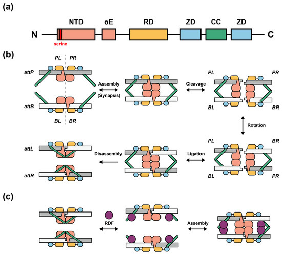 Domains and proposed recombination model of serine integrases. (a) General structural domains and motifs of serine integrases. NTD: N-Terminal catalytic Domain; αE: flexible linker; RD: Recombinase Domain; ZD: Zinc ribbon Domain; CC: Coiled-Coil motif. ZD is embedded between the two ZDs; CC is divided into two antiparallel helical segments. (b) Proposed model of serine integrase-mediated recombination. First, integrase dimers specifically bind to attP or attB site depending on the ZD binding position. Second, dimer–attP and dimer–attB complexes will be automatically assembled as homologous tetramer by stabilization between CCs interaction. Third, integrase monomers cleave attP and attB sites and form 5′-phosphoserine linkages, DNA half-sites, and 3′ dinucleotide overhangs (2 bp). Then, PL-BL or PR-BR dimeric complexes will rotate 180° along the horizontal axis. After that, PL-BR and BL-PR dimeric complexes will be formed by ligation between DNA strands, called attL and attR. Finally, the CCs will be conformationally changed and form a new internal interaction along with the same DNA double strand rather than two heterologous DNA strands, which leads to disassembly and inhibits reversible exchange. (c) Proposed structural model of serine integrase-mediated reverse recombination. RDFs bind to CCs and alter the integrase–attL and integrase–attR internal interactions. The released CCs may interact with each other located on two heterologous DNA strands and reassemble again.