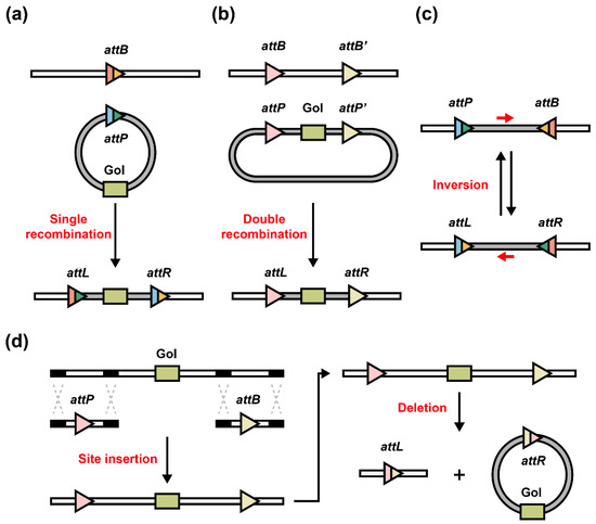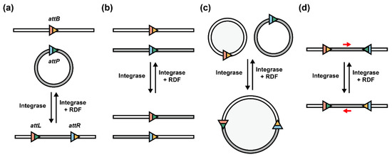 - Stark, W.M. Making serine integrases work for us. Curr. Opin. Microbiol. 2017, 38, 130–136. [Google Scholar] [CrossRef]