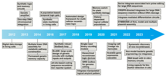 Timeline of milestones in serine integrase-associated synthetic biology.