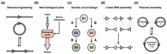 Depending on the purposes, serine integrases can be utilized as DNA manipulation tools both in vitro and in vivo. First, serine integrases are broadly developed as diverse genome engineering tools in different hosts (e.g., bacteria [66], yeast [67], mammalian cells [68,69,70,71], animals [63,72], and plants [61,62,73,74]), and catalyze various reactions (e.g., integration and deletion) (Figure 4a). Second, serine integrases inspire the creative designs of new biological parts (Figure 4b) and the assembly of comprehensive genetic circuits (Figure 4c). Furthermore, orthogonal serine integrase systems enable in vitro assembly of either linear DNA (Figure 4d) [32] or circular DNA (Figure 4e) [50]. Both can produce large biobricks and assemble several independent modules for the designed applications, for example, the biosynthesis of carotenoid [75], erythromycin [76], and the co-expression of chromoproteins [50].
