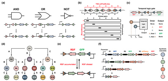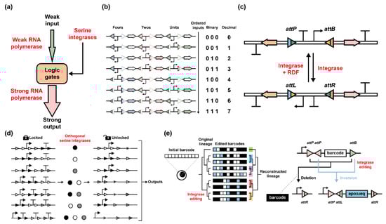 In 2013, Siuti et al. proposed synthetic genetic circuits that associated serine integrases with logic gates and memory circuits in living cells [37]. For proof of concept, two orthogonal serine integrases Bxb1 and phiC31 were utilized to build up several Boolean logic gates like AND, OR, and NOT gates (Figure 7a). A simple demonstration was the regulation of a promoter–terminator(s)–output circuit. Serine integrases regulated these circuits via reversion/deletion of basic parts, while the GFP fluorescence signal could be measured as an output signal. This study represents a serine integrase-based genetic circuit design milestone, inspiring others to design many more complex circuits (e.g., multiple layers with diverse inputs and outputs [46]) to control cells’ behaviors. Afterward, Yang et al. expanded the memory circuits by identifying 34 new phage integrases and several engineered memory switches were built up that could record up to 1.375 bytes of information (Figure 7b) [39]. This achievement demonstrated that multiple orthogonal integrases could be programmed, and the genetic information could be permanently recorded in living cells. Then, Hsiao et al. presented a two-input temporal logic gate that could sense and record the order of the inputs, the timing between inputs, and the duration of input pulses (Figure 7c) [42]. The overlaps of two orthogonal integrases’ attP/attB sites enabled E. coli cells to produce distinct output signals referring to altered input times, which provided a time-dependent, integrase-based genetic circuit design. Furthermore, a population-level distribution containing multiple single cells could be utilized to deduce the order, timing, and duration of transient environmental inductions. To meet this demand, Roquet et al. developed the genetic state machines in living cells to regulate complex gene expression, in which three inducible serine integrases could make one strain to be converted into sixteen different states by the variation of orthogonal attP/attB orders (Figure 7d) [43].