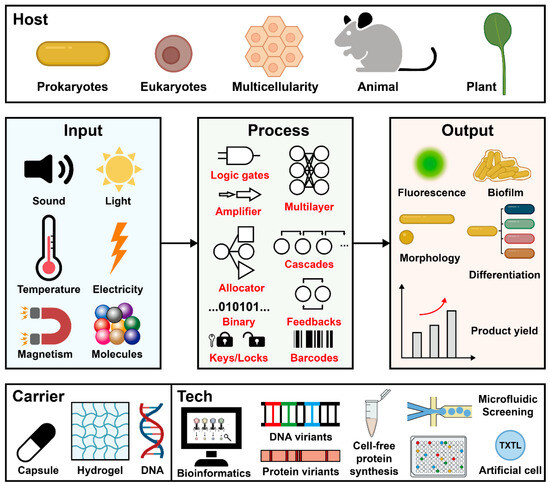 Depending on genetic information processing, the host can export diverse outputs (Figure 8, middle right). The general output signal is fluorescence, including fluorescent proteins and luciferases. Additionally, engineered microorganisms could produce amyloid fibers [59] and natural products [76,82,101] as output signals. Furthermore, the processed signals enable bacteria to reprogram their phenotypes. An impressive work by Kasari et al. reported the decoupling of E. coli growth and production by removing the chromosomal origin of replication (relying on the phiC31 expression under the control of temperature-sensitive cI857 repressor), which caused the elongation phenotype of E. coli as filaments [102]. E. coli cells could also become spheres by removing the mreB gene [103]. Another phenotype change is cell differentiation. Recently, Zúñiga et al. [41] and Williams et al. [51] engineered two integrase-mediated differentiation circuit series to create multicellular diversities from one E. coli mother cell.
