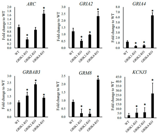 RT-qPCR assay showing the expression of six schizophrenia-associated genes (ARC, GRIA2, GRIA4, GABRB3, GRM8, and KCNJ3) in edited SH-SY5Y cells (GRIK1-KO, GRIK2-KO, and GRIK4-KO) and WT cells. The GAPDH gene was used as the endogenous gene for normalization. The data are expressed as fold change to WT ± SD (* p < 0.05, n = 6).