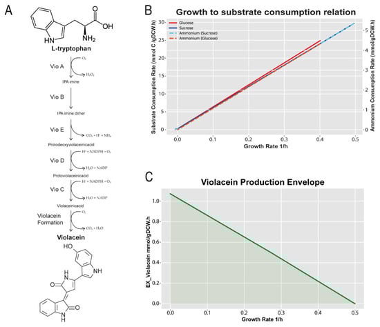 To incorporate the biosynthesis pathway of violacein from tryptophan (Figure 5A) into the iMA1267 model, we extended its reactions. To generate the production envelope (Figure 5C), we utilized the reported glucose uptake rate of 5.16 mmol/gDCWh [18] as the lower bound within the minimal M9 medium.