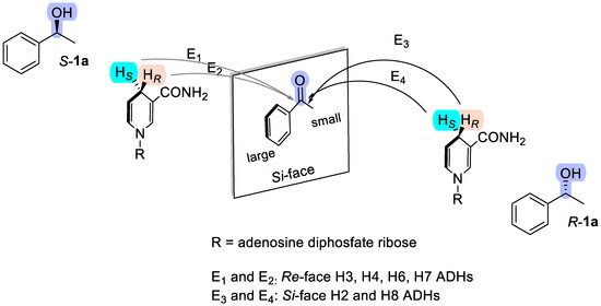 In general, the biotransformation of prochiral ketones by microorganisms follows the Prelog model [21], i.e., enzymes have large and small pockets that form the active site in which the substrate binds and controls the stereoselectivity of the product based on the geometry of the substrate and coenzyme NAD(P)H (Figure 2). Within this context, the stereospecific alcohol dehydrogenases (ADHs) transfer the hydride ion (H−) of NAD(P)H to the Re-face of prochiral ketones, and they are usually transformed to (S)-chiral alcohols. However, it should be noted that the R/S definition, according to the Cahn–Ingold–Prelog priority rule, is conversely exhibited by the substituted group containing higher priority atoms at its chiral center, for example, -CH2Cl. Many ketone-reducing enzymes follow this rule and give Prelog chiral alcohols, such as (S)-1-Phenylethanol from Acetophenone (Table 1, entries 1–5) [22]. In contrast, dehydrogenases/reductases, such as H8 ADHs, in which the hydride ion (H−) of NAD(P)H is transferred from the Si-face of ketones and yields anti-Prelog chiral alcohols, such as (R)-1-Phenylethanol from acetophenone, are rare in nature (Table 1, entry 6).
