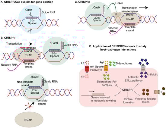 CRISPR/Cas system and its applications in host–pathogen interaction studies: (A) CRISPR/Cas9-mediated gene knock out: The Type II CRISPR/Cas9 system consists of a single guide RNA (sgRNA) and the Cas9 nuclease (blue circle). The sgRNA guides Cas9 to its target sequence in the pathogen’s genome, where Cas9 induces double-strand breaks. This disruption results in the elimination or functional inactivation of the target gene. (B) CRISPR interference (CRISPRi): CRISPRi uses a catalytically inactive (“dead”) Cas9 (dCas9) (green circle) that retains DNA-binding ability but lacks nuclease activity to knock down the expression of the gene of interest (GOI). When guided by an sgRNA to a target sequence, dCas9 inhibits transcription through steric interference. It achieves this either by binding downstream of the transcriptional elongation complex (TEC), causing TEC stalling (upper panel), or by binding to the promoter region of the gene of interest (GOI), preventing RNA polymerase (RNAP) from binding and initiating transcription (lower panel). (C) CRISPR-associated gene activation (CRISPRa): CRISPRa involves a modified Cas9 from the CRISPRi system fused to the omega subunit of RNA polymerase. The sgRNA-Cas9 complex binds upstream of the target promoter, facilitating the recruitment of RNA polymerase to enhance gene expression. This approach effectively activates transcription of the target gene. (D) Applications in host–pathogen interaction studies: The CRISPR/Cas system is widely used in unraveling the mechanisms of pathogenicity in various bacterial pathogens. It is employed to study the roles of virulence factors, including genes involved in iron acquisition, biofilm formation, toxin production, and antibiotic resistance. Additionally, CRISPR/Cas tools facilitate the investigation of essential metabolic genes critical for pathogen survival in hostile host environments.