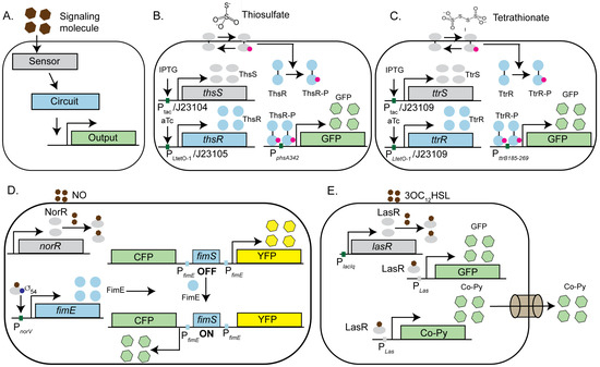 Inflammatory bowel diseases (IBD), including Crohn’s disease (CD) and ulcerative colitis (UC), are chronic inflammatory conditions of the gastrointestinal tract. These diseases are linked to an imbalance in the gut microbiome, known as dysbiosis, and the resulting immune response, which involves genetic susceptibility, microbial factors, and environmental triggers. Gastrointestinal pathogens are a common cause of dysbiosis and have been implicated in both the onset and exacerbation of IBD. One of the key aspects of treating IBD is early detection of its biomarkers. To address this, the E. coli Nissle strain was also engineered to develop biosensors capable of detecting markers of gut inflammation in response to Salmonella infection [113]. Previous studies have shown that Salmonella species can exploit the macrophage-mediated inflammatory response to facilitate the establishment of an infection. Reactive oxygen species generated during inflammation react with luminal sulfur compounds, such as H2S, to produce thiosulphate (S2O32−), which can be further oxidized to tetrathionate (S4O62⁻). The ability to utilize tetrathionate as a terminal electron acceptor provides S. Typhimurium with a unique growth advantage over competing species in the inflamed gut lumen. Using synthetic biology tools, Daeffler et al. have modified the widely used probiotic E. coli Nissle strain to sense both the markers of inflammation (thiosulfate and tetrathionate) in a dextran sodium sulfate (DSS) murine model of colitis [113]. To accomplish this, the authors employed a thiosulfate and tetrathionate sensor, along with their respective response regulators, from the marine bacteria Shewanella species as there was no previous report of genetically encoded thiosulfate sensor available, and the only known tetrathionate sensor is the TtrSR two-component system (TCS) from Salmonella typhimurium. In the presence of a signaling molecule (thiosulfate or tetrathionate), the sensor protein (ThsS or TtrS) phosphorylates its cognate response regulator (ThsR or TtrR), which in turn activates the downstream reductase operon that can utilize thiosulfate or tetrathionate, respectively (Figure 2B, C). Although thiosulfate reductase is regulated by the catabolite repressor protein (CRP), the tetrathionate reductase operon is naturally regulated by oxygen and nitrate levels through the global regulator FNR, making it prone to cross-repression in the gut environment. Since oxygen and nitrate levels are elevated during inflammation, these regulatory complexities reduce the reliability of the TtrSR system as a sensor for tetrathionate in this context. To overcome this limitation, the authors engineered the reductase operon under the control of catabolite repressor protein (CRP) instead of FNR, thus eliminating the influence of fluctuating O2 levels in the gut. GFP fluorescence was used as a readout to detect the presence of thiosulfate or tetrathionate in a murine infection model. Using flow cytometry, the authors demonstrated the activation of the thiosulfate sensor in response to gut inflammation during the murine infection, confirming the validity of the assay [113]. In summary, these engineered microbes have the potential for early disease detection to facilitate therapeutic intervention promptly.