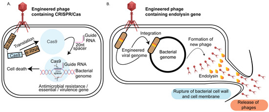 Phage therapy-based approaches for targeted pathogen elimination: (A) CRISPR/Cas phage engineering: The bacteriophage genome is modified to include CRISPR/Cas genes. Upon infection, the phage transfers its genome into the bacterial host where the Cas9 gene is translated by the host translational machinery and guided by a specific gRNA to target sequences that can be an antimicrobial resistance gene, a virulence factor, or an essential gene. Cas9-induced double-stranded breaks in the target DNA result in bacterial cell death. (B) Endolysin phage engineering: The bacteriophage genome is engineered to carry endolysin genes. During the lytic phase, these genes are expressed by the bacterial host, producing endolysins that degrade the peptidoglycan layer of the cell wall. This leads to bacterial lysis, pathogen death, and the release of new phage progeny.