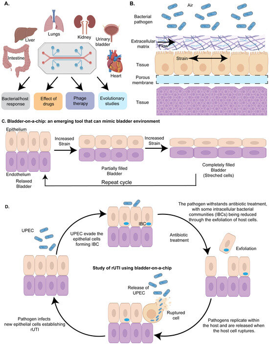 Organ-on-a-chip to study host–pathogen interactions: (A) Overview of various organs modeled using organ-on-a-chip technology to investigate the molecular mechanisms of infectious diseases and the potential applications of this approach. Organ-on-a-chip is used to decipher bacterial and host response, to study the effect of drugs, antimicrobials and engineered bacteriophages (phage therapy) on bacterial pathogens, and to study genetic and epigenetic changes in response to the environment. (B) A simplified diagram of a model organ-on-chip illustrating the layered structure of the chip. The top layer contains the pathogenic bacteria of interest, followed by the extracellular matrix. Nutrients, growth factors, and drugs flow through this layer to replicate the host environment (e.g., gut). Beneath this, the first host cell layer is represented, such as umbrella cells in a urinary bladder model. The chip design includes a mechanical strain to simulate physiological conditions, such as peristaltic motion in a gut model or the stress that bladder epithelial cells undergo during filling and voiding in a urinary bladder model. A porous membrane is located below the host cell layer, enabling the efficient exchange of chemicals with the underlying tissue layer. (C) Bladder-on-a-chip: a tool mimicking the urinary bladder environment: The bladder-on-a-chip is an innovative device designed to replicate the environment of the urinary bladder. It consists of an upper chamber lined with bladder epithelial cells and a lower chamber containing endothelial cells. By incorporating mechanical strain that simulates the natural expansion of bladder cells during urine storage and their subsequent relaxation during micturition, this device closely mimics the in vivo conditions of the urinary bladder. This realistic model provides a valuable platform for studying host–pathogen interactions. (D) Bladder-on-a-chip in recurrent UTI studies: The bladder-on-a-chip is used to investigate the mechanisms underlying recurrent urinary tract infections (rUTIs). Uropathogenic Escherichia coli (UPEC) are introduced into the upper chamber, where they adhere to the epithelial cells. Some UPEC evade the host immune response by invading the epithelial cells and forming intracellular bacterial communities (IBCs). Upon antibiotic treatment, extracellular UPEC that failed to invade the cells are eliminated, but those within IBCs are shielded from the antibiotics. These protected bacteria multiply within the host cells and are released into the external environment upon host cell rupture. The released UPEC then infect new epithelial cells, perpetuating the cycle of recurrent UTIs.