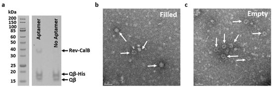 (a) Autoradiogram analysis of Qβ VLPs from CFPS reactions in the presence of Rev-CalB with and without added RNA aptamer. The absence of a Rev-CalB band when RNA aptamer was not added shows that encapsulation is ineffective without the aptamer. The protein molecular weight ladder (left) is from the original SDS-PAGE gel used to develop the autoradiogram (right) and is aligned to the developed autoradiogram. (b,c) TEM images of filled and unfilled VLPs. The arrows indicate locations of VLPs. The white scale bar in the bottom left corner of each image represents a size of 50 nm.