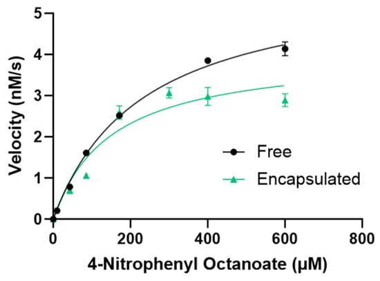 Michaelis–Menten parameters for free versus encapsulated Rev-CalB obtained using GraphPad Prism 10 software. ± values represent the standard deviation from n = 3 assays.