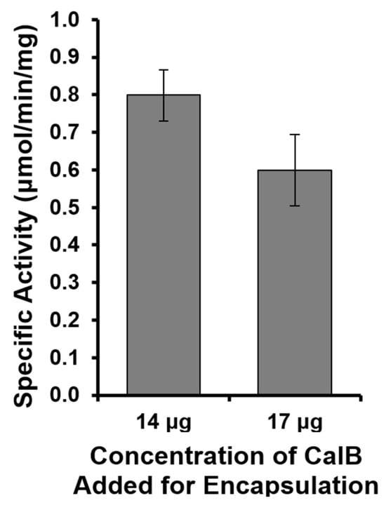 The specific activities of the encapsulated enzymes produced with 13.9 and 17 μg of added enzyme to the 160 μL encapsulation reaction were calculated and plotted in comparison to the added enzyme quantities (Figure 4). The data indicate that, with higher packaging densities of CalB inside the VLP, there is a slight decrease in the specific activity. This is somewhat expected as the more crowded environment would increase CalB-CalB and CalB-Qβ interactions, which could have a negative effect on enzyme flexibility and activity.