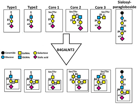 - Groux-Degroote, S.; Vicogne, D.; Cogez, V.; Schulz, C.; Harduin-Lepers, A. B4GALNT2 Controls Sda and SLex Antigen Biosynthesis in Healthy and Cancer Human Colon. ChemBioChem 2021, 22, 3381–3390. [Google Scholar] [CrossRef] [PubMed]
