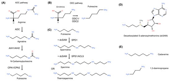In microalgae, these polyamines, especially putrescine and spermidine, can accumulate in high concentrations, leading to processes associated with cell proliferation, growth, and resistance to environmental stress by regulating the cell cycle and antioxidant responses [29]. Of note, in C. reinhardtii (green algae), spermine has not consistently been identified so far, and its cellular uptake from the environment is not consistently demonstrated [15,30].