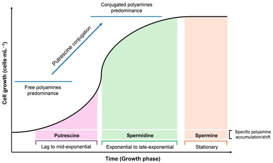 The reviewed topics indicate that different polyamines may be required at distinct growth stages (Figure 2). Free polyamine levels are higher in the lag phase, whereas conjugated polyamines dominate during exponential growth, increasing sevenfold compared to free forms. In A. minutum T1 cells, free polyamine levels peak in the lag phase before declining in the exponential phase, except for cadaverine and nor-spermidine, which increase slightly before decreasing mid-exponential phase. Putrescine and cadaverine are the primary conjugated polyamines, and spermine levels rise significantly during the death phase [24]. Similarly, in Thalassiosira pseudonana, polyamine concentrations increase significantly during exponential growth [56]. In Nicotiana tabacum L. (land plant), corolla spermine also appears correlated with cell death promotion [57].