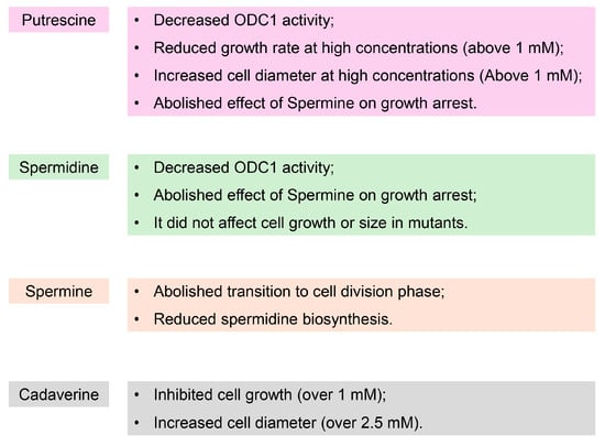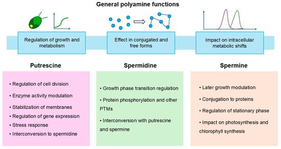 In a previous report, it was inquired whether there is a specific function for each polyamine, or if their global concentration oscillation is the responsible factor to modulate growth [7]. Investigation across different microalgal species following alterations of the concentration of putrescine, spermidine, and spermine suggests that specific types of shifts in their intracellular concentration occur at target metabolic moments (e.g., specific phases of the cell growth curve). Some shifts seem to be characteristic of a broad range of organisms, and some of them are species-specific, as reported in the literature [53].