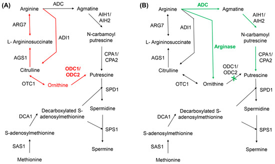 Insights on possible metabolic re-routing of the polyamines’ biosynthesis toward growth acceleration. (A) Diagram of the main biochemical reactions currently related to the polyamine’s synthesis in the microalgae C. reinhardtii. Red arrow: reactions described as active in ordinary non-stress mixotrophic growth. (B) Diagram of the proposed biochemical reactions to be included and activated towards controlled polyamine synthesis in the microalgae C. reinhardtii. Green arrow: reactions to be activated in proposed engineered high-growth phenotype. Abbreviations—SAS1: S-adenosylmethionine synthetase 1; SPS1: Spermine synthase 1; DCA1: adenosylmethionine decarboxylase; SPD1: Spermidine synthase 1; OTC1: Ornithine transcarbamylase 1; ODC1: Ornithine decarboxylase 1; ODC2: Ornithine decarboxylase 2; CPA1: N-carbamoylputrescine amidase 1; CPA2: N-carbamoylputrescine amidase 2; AGS1: Agmatine ureohydrolase 1; ADI1: Arginine decarboxylase 1; ARG7: Argininosuccinate lyase; AIH1: Agmatine iminohydrolase enzyme 1; AIH2: Agmatine iminohydrolase enzyme 2; ADC: Arginine decarboxylase; Arginase: Arginase.