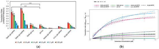 Translation analysis: (a) translation rates of SKIK-tagged and non-tagged constructs were measured at different substrate (mRNA) concentrations (0.08–1 μM), with translation efficiency quantified by the fluorescence intensity of synthesized sfGFP. (b) shows measured translation rates (data points) along with fitted curves derived from the Hill equation, used for kinetic parameter estimation. For comparison, curves based on the Hill equation with a fixed coefficient (n = 1) are shown as dashed lines, whereas best-fit curves with variable Hill coefficients are shown as solid lines. Translation rates were calculated as the increase in sfGFP concentration (mM) normalized to ribosome concentration, per second, during the linear phase of the reaction. All data represent the mean ± SD from three independent experiments (n = 3). In panel (a), statistical significance was evaluated by one-way ANOVA followed by Dunnett’s multiple comparison test, with SKIK-Δ6-WPPP and SKIK-Δ5-IWPPP compared to Δ0-full at 1.0 µM mRNA concentration. Significant differences are indicated as *** p < 0.001.