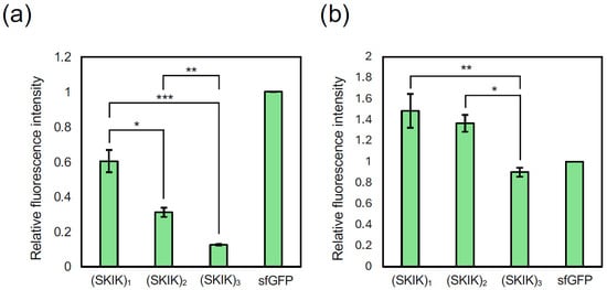 Effect of N-terminal SKIK repeats on sfGFP expression in vitro and in vivo. (a) In vitro translation using a CFPS system. Fluorescence intensity of sfGFP was measured for each construct with different N-terminal sequences: single, double, and triple SKIK repeats ((SKIK)1, (SKIK)2, (SKIK)3) attached to IWPPP-sfGFP. The sfGFP construct without any additional tags was utilized as a reference, and all fluorescence values are normalized to that of untagged sfGFP. (b) In vivo expression in E. coli BL21(DE3) cells. Fluorescence intensity of sfGFP for each construct is presented as relative fluorescence intensity normalized to untagged sfGFP. Each bar represents the mean ± SD from three independent replicates (n = 3). Statistical significance was evaluated by one-way ANOVA followed by Tukey’s multiple comparison test. Significant differences are indicated as * p < 0.05, ** p < 0.01, and *** p < 0.001.