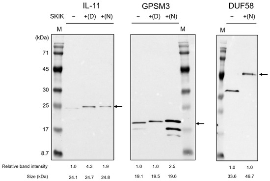 Effect of SKIK tagging on the expression of polyproline-containing proteins: Western blot analysis of IL-11, GPSM3, and DUF58 constructs expressed in a CFPS system. Constructs contain either no tag, Direct SKIK (+(D)), or N-terminal SKIK (+(N)). Band intensities relative to untagged constructs and their molecular weights calculated using Image Lab software are shown under the gel image. Arrows indicate theoretical molecular weights based on the sequence information.