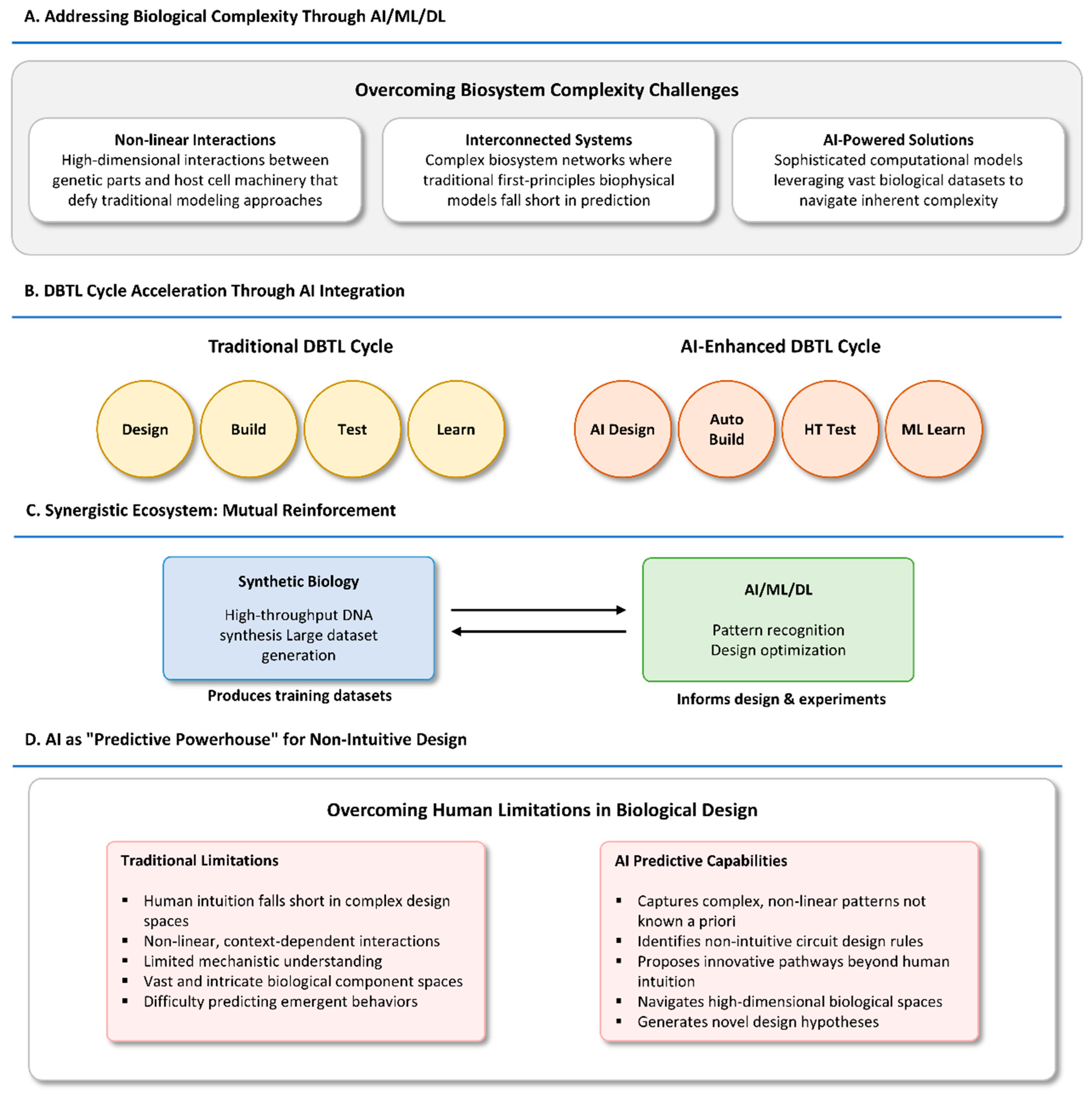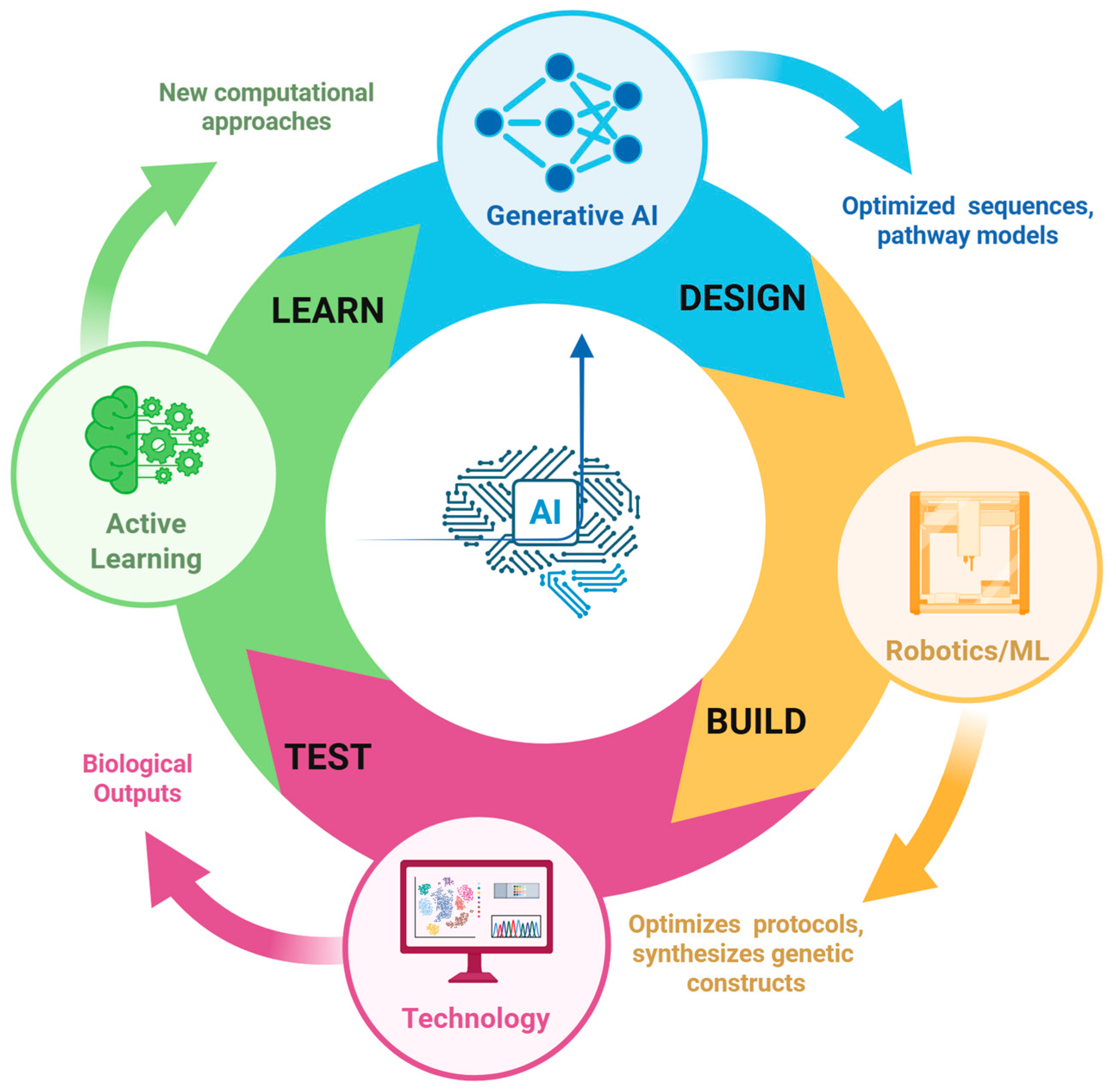 | Design | Ad hoc, intuition-driven methods: Designers often rely on trial-and-error due to the inherent complexity and non-linear interactions within biological systems. This approach is time-consuming and lacks predictability in output behavior. Difficulty arises in predicting the precise behavior of novel genetic circuits or pathways. | Predictive modeling & generative AI: Predictive modeling of genetic circuits, metabolic pathways, and cellular responses allows in silico validation before experimental work. De novo sequence generation for proteins, RNA, and DNA elements (e.g., promoters, RBS using generative models (e.g., GANs, VAEs) that adhere to biological constraints. Optimization of DNA sequences for expression, stability, or specific functionalities. AI-driven recommendations for optimal experimental designs and component selections, exploring vast design spaces far beyond human capacity. | Accelerated design & enhanced success rates: Significantly reduced design iterations, minimizing costly and time-consuming experimental cycles. Higher probability of successful outcomes due to in silico validation and optimized component selection. Enhanced precision and predictability in desired biological functions. Exploration and discovery of non-intuitive or counter-intuitive designs that would be inaccessible through traditional, heuristic approaches. Expedited time-to-market for novel biological products and therapies. | DL for gene/promoter design: DL models (transformers, CNNs) accurately predict gene expression and optimize sequences in silico. De novo rational design; transformer models for synthetic promoter design [14]. CNNs to design N-terminal coding sequences, resulting in increase in protein expression [15]. RL for protein design [16] |