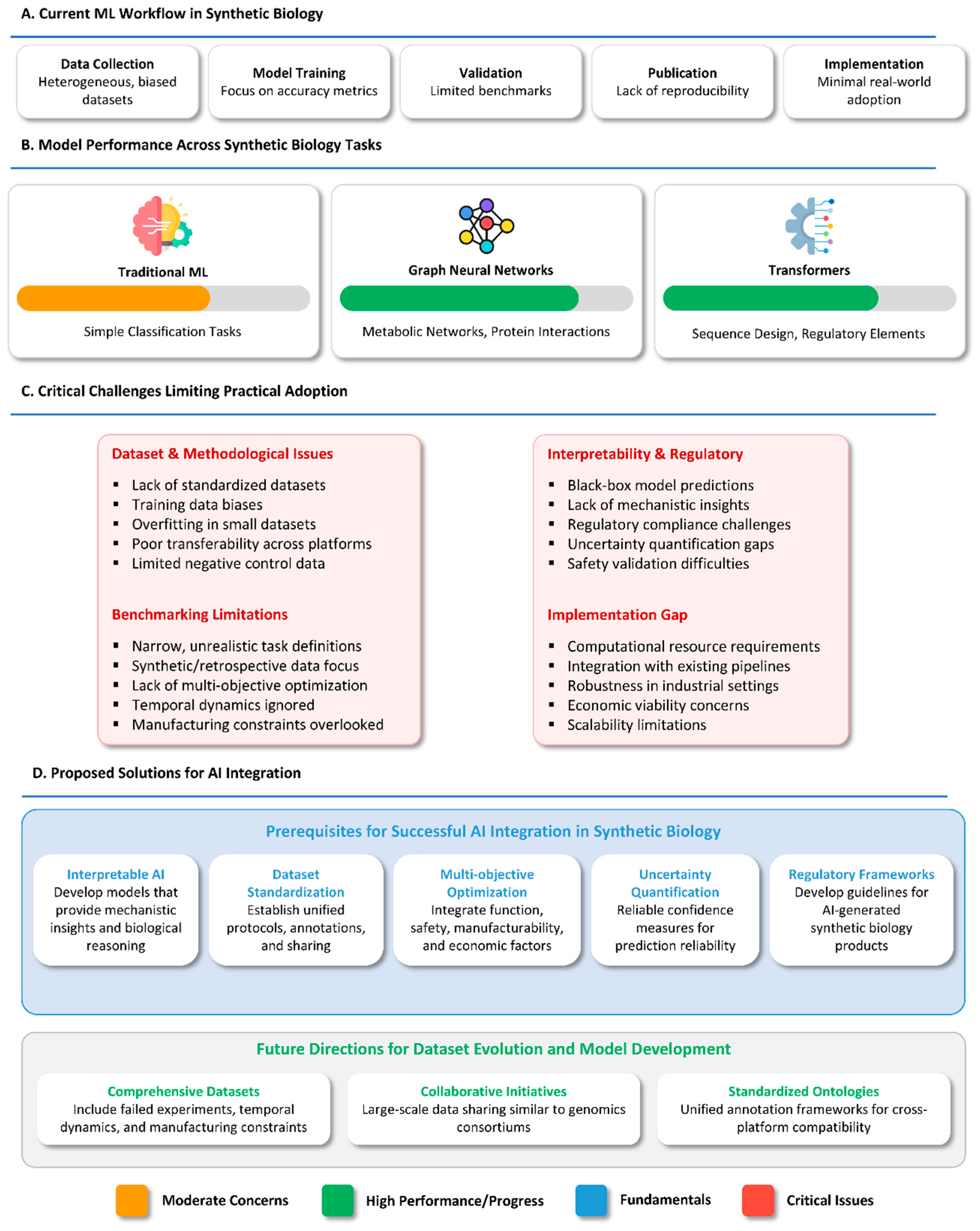 | Regulatory frameworks | Establish policies and standards that can assess and approve AI-designed biological products without compromising safety. | Critical for commercialization, public trust, and long-term viability of AI-enabled products. | Regulatory ambiguity; lack of precedent and guidelines for AI-derived biological constructs. |