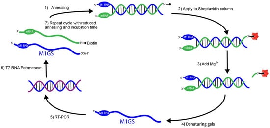 In vitro selection of mRNA-cleaving M1GS ribozymes. The in vitro selection procedure for engineering RNase P ribozymes (M1GS) variants that target an mRNA substrate more efficiently begins by generating a randomized ribozyme pool annealed to a biotinylated target mRNA at 37 °C (step 1). This complex is then bound to a streptavidin column (step 2), and activated by the addition of (step 3). Under these in vitro conditions, high concentrations allow the M1 RNA to fold into its catalytic 3D structure without its protein cofactor. Active ribozymes are recovered from denaturing gels (step 4), reverse-transcribed and PCR-amplified (step 5), then transcribed back into M1GS RNA (step 6). The M1GS RNA is reintroduced into subsequent rounds with reduced annealing and incubation times to increase selection stringency (step 7).